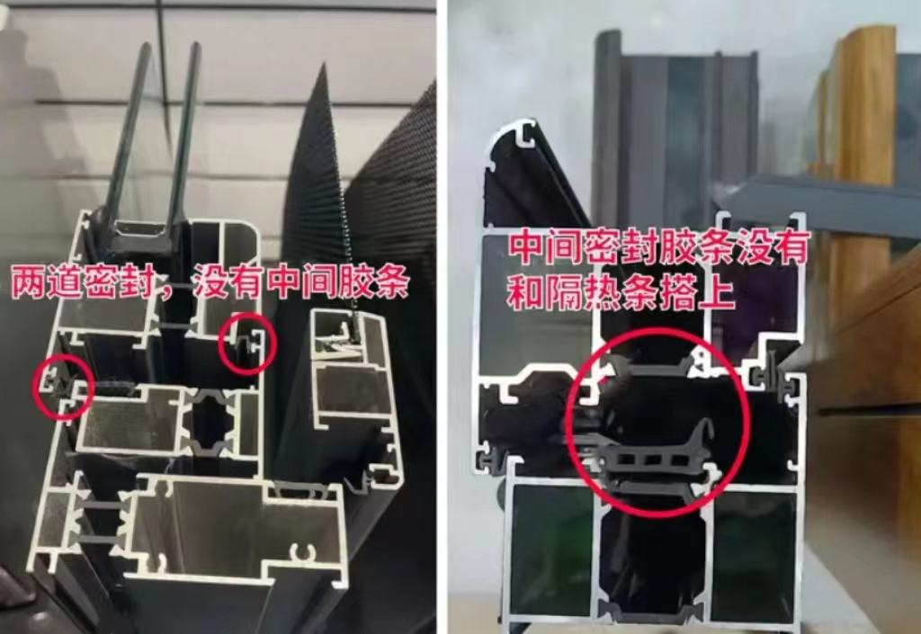 分別是外側(cè)、中間、內(nèi)側(cè),并且中間密封必須是有效的。中間的密封條叫做等壓膠條,像下面這種,等壓膠條沒有和隔熱條或者型材搭接(最理想的狀態(tài)是和隔熱條搭接),那就是一道擺設(shè),實(shí)際上還是兩道密封。